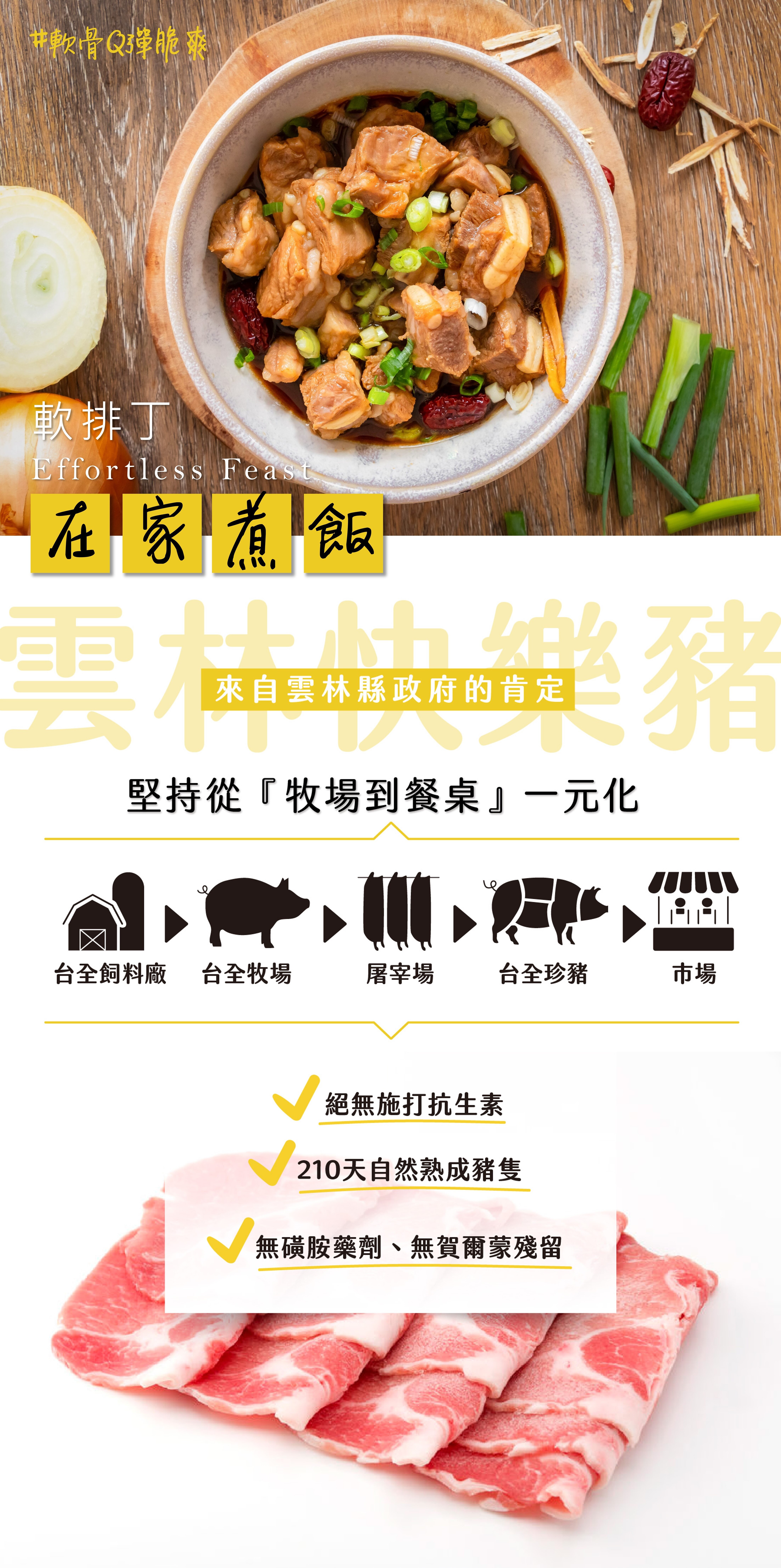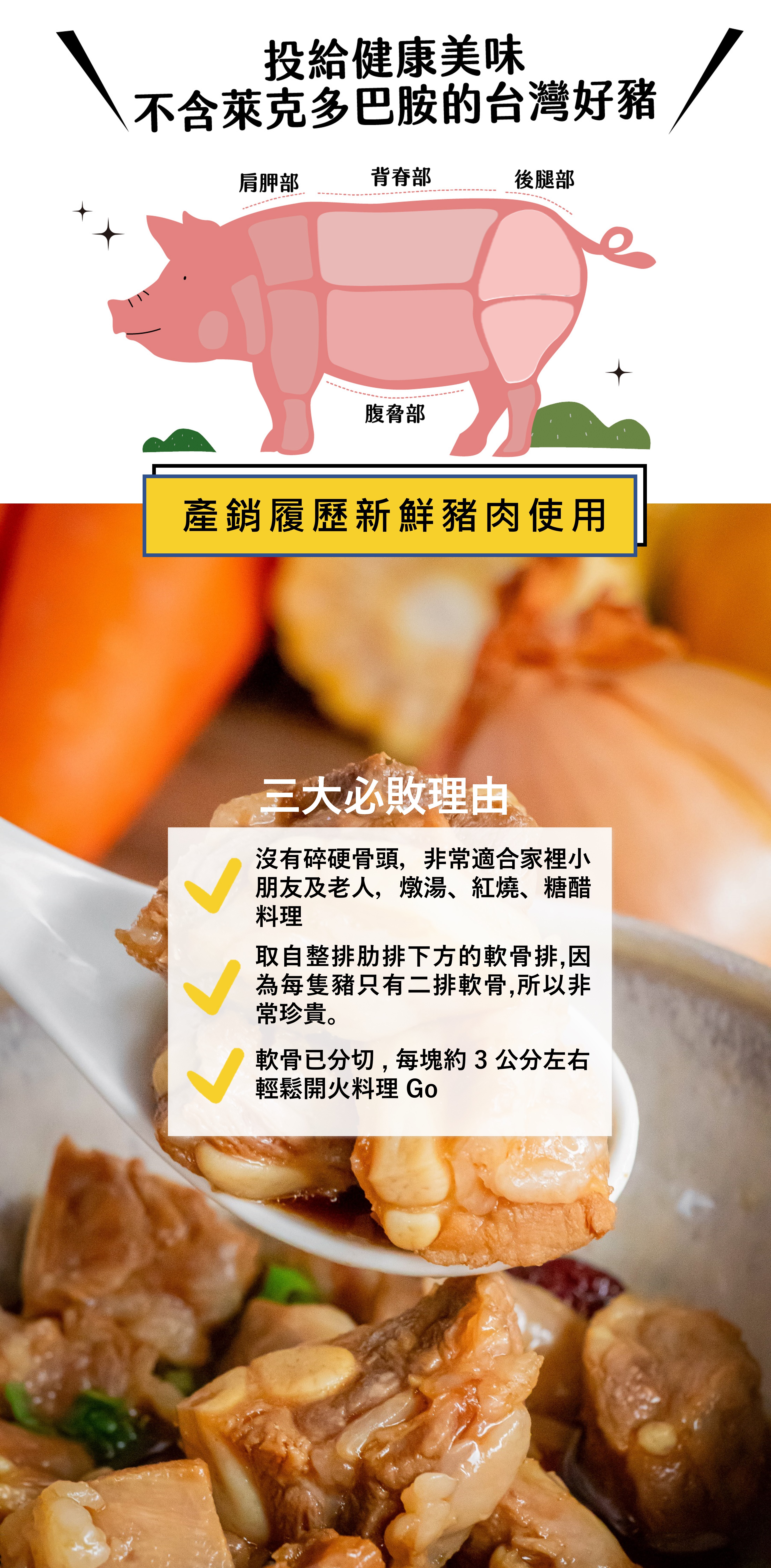 嚴選自快樂豬腹脇部的軟骨肉。每隻豬僅有兩排軟骨,產量少非常珍貴。軟骨不會有碎的硬骨頭,非常適合熬湯給小朋友和年長者食用唷!常見料理:紅燒軟排肉、豆豉滷排骨、金針排骨湯、清燉蘿蔔排骨湯、粉蒸排骨、排骨燜飯。