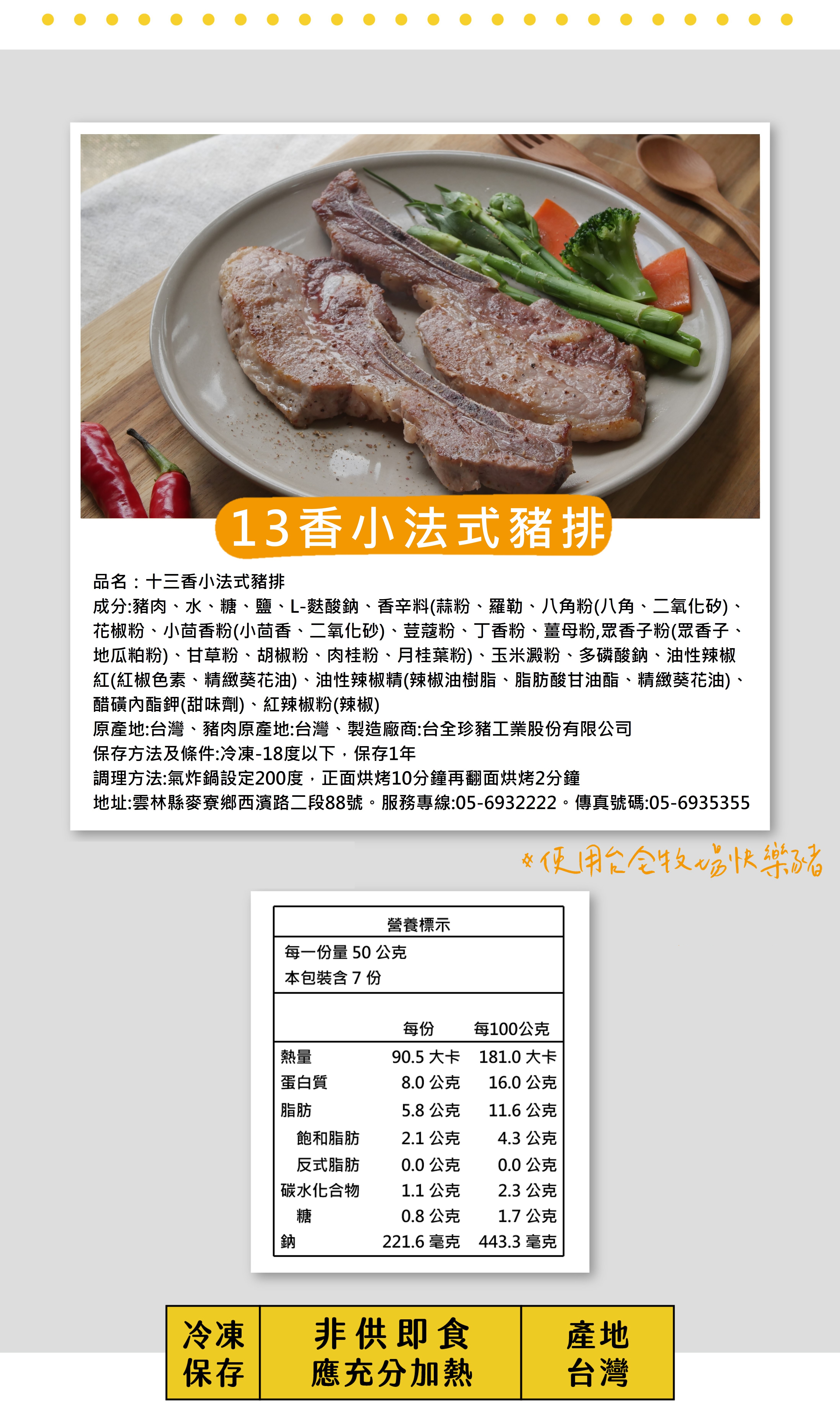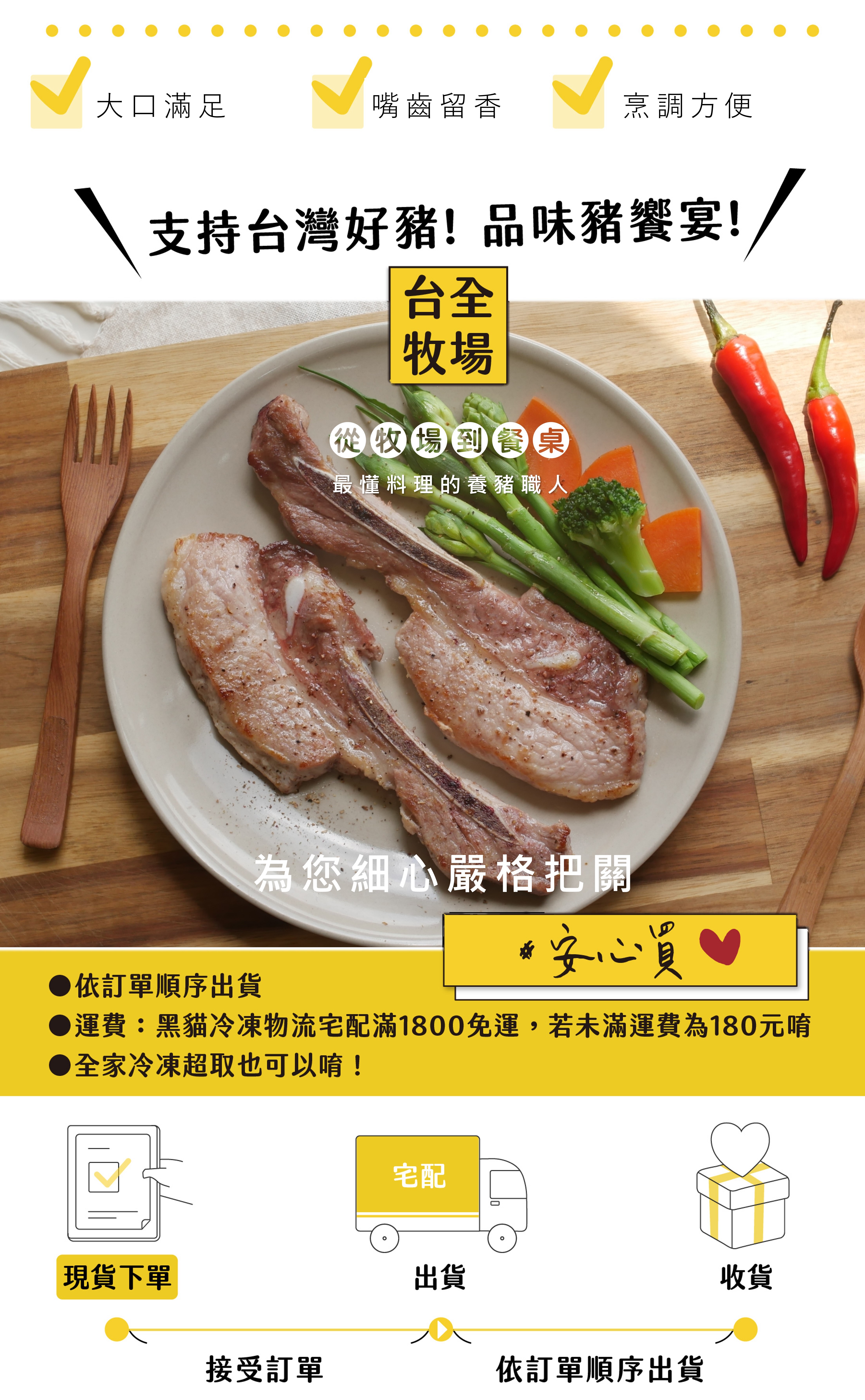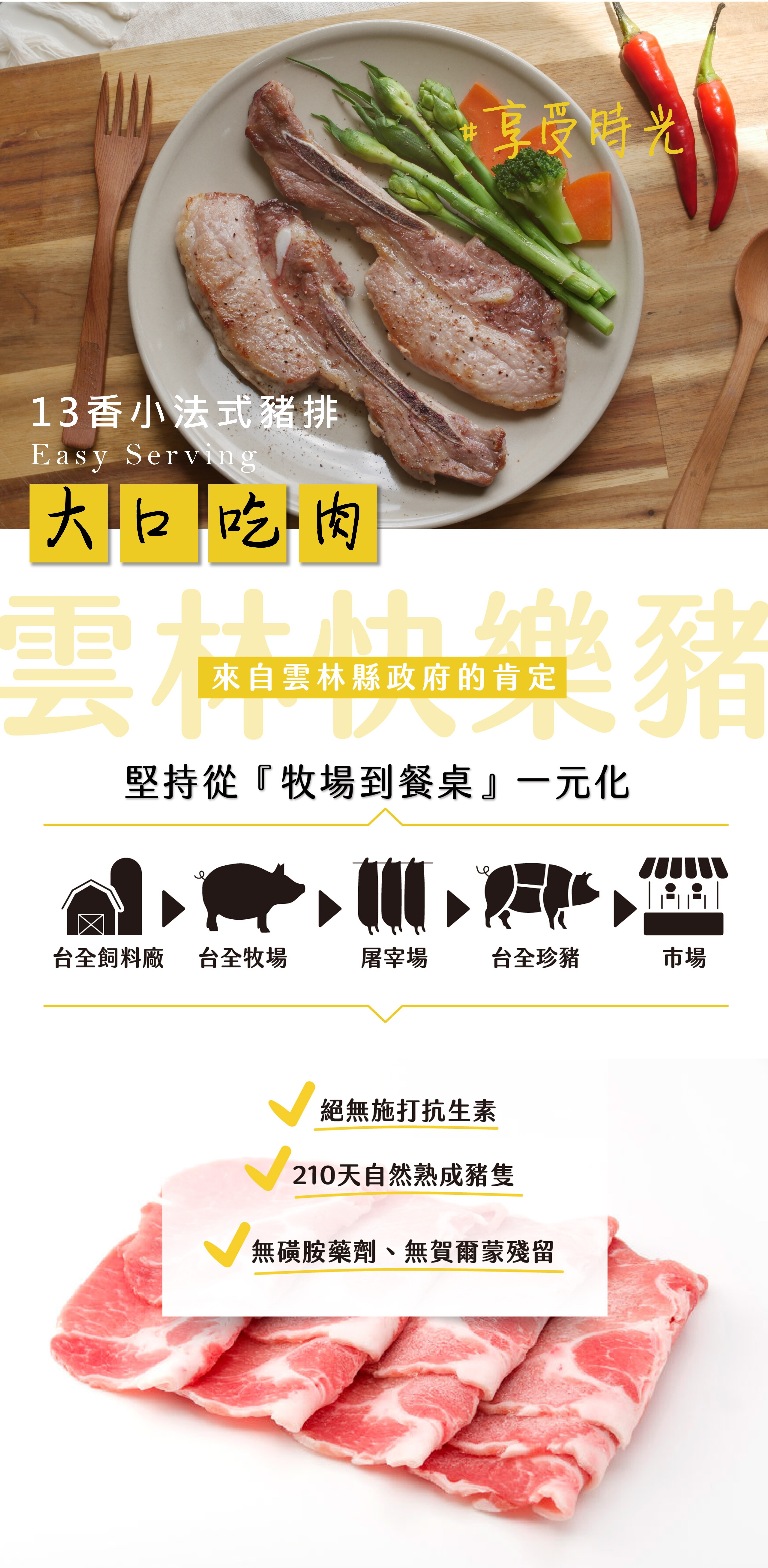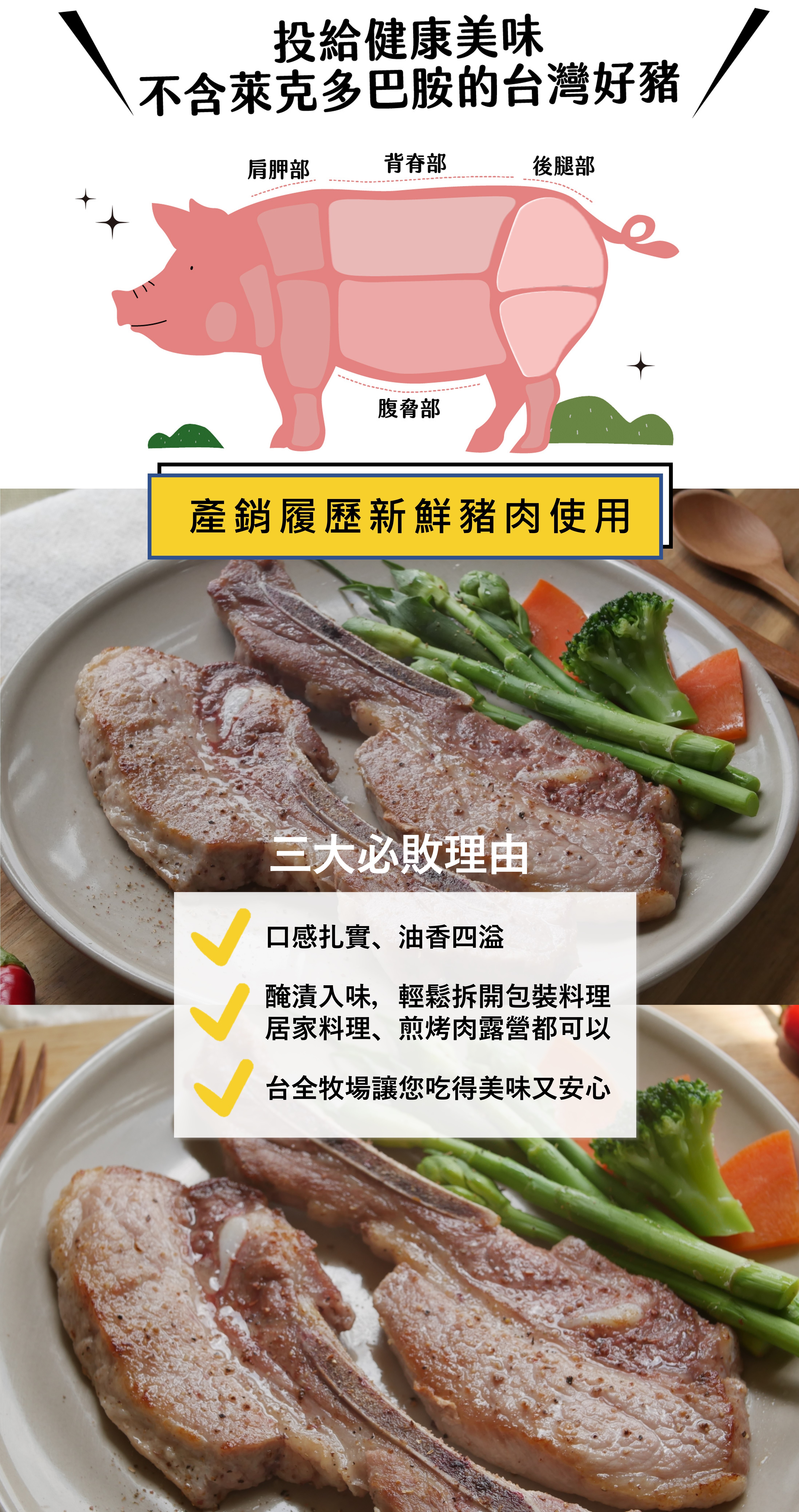嚴選台全快樂豬小戰斧 (小法式豬排),採用獨家秘製醃料,肉質軟嫩,帶骨處有咬勁,多層次口感!一人一根嘟嘟好~解凍後煎熟即可上桌,煮婦(夫)們最愛的快速便利料理!