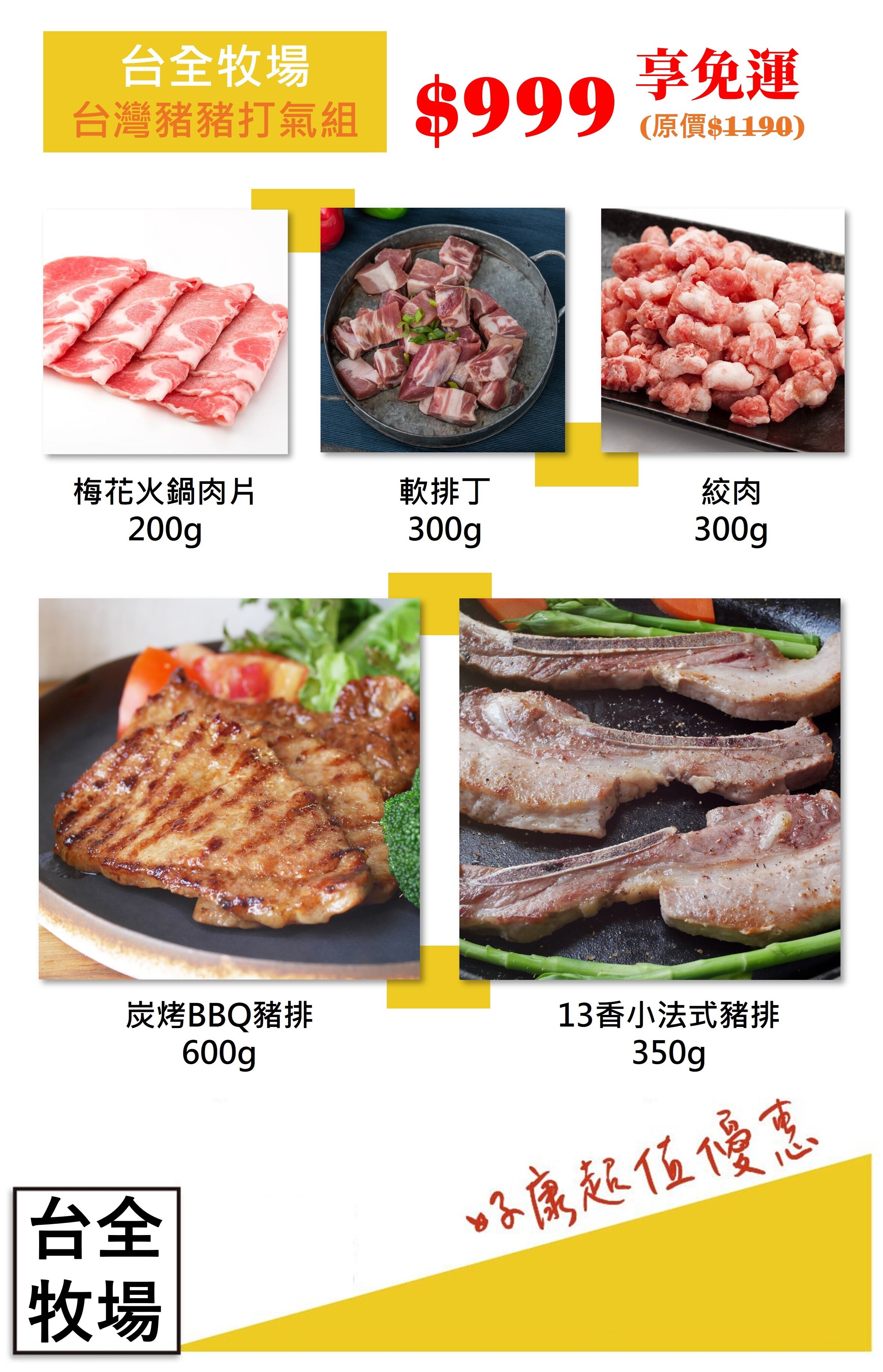組合包含梅花火鍋肉片200g、軟排丁300g、絞肉300g、13香小法式豬排350g、炭烤BBQ豬排600g。