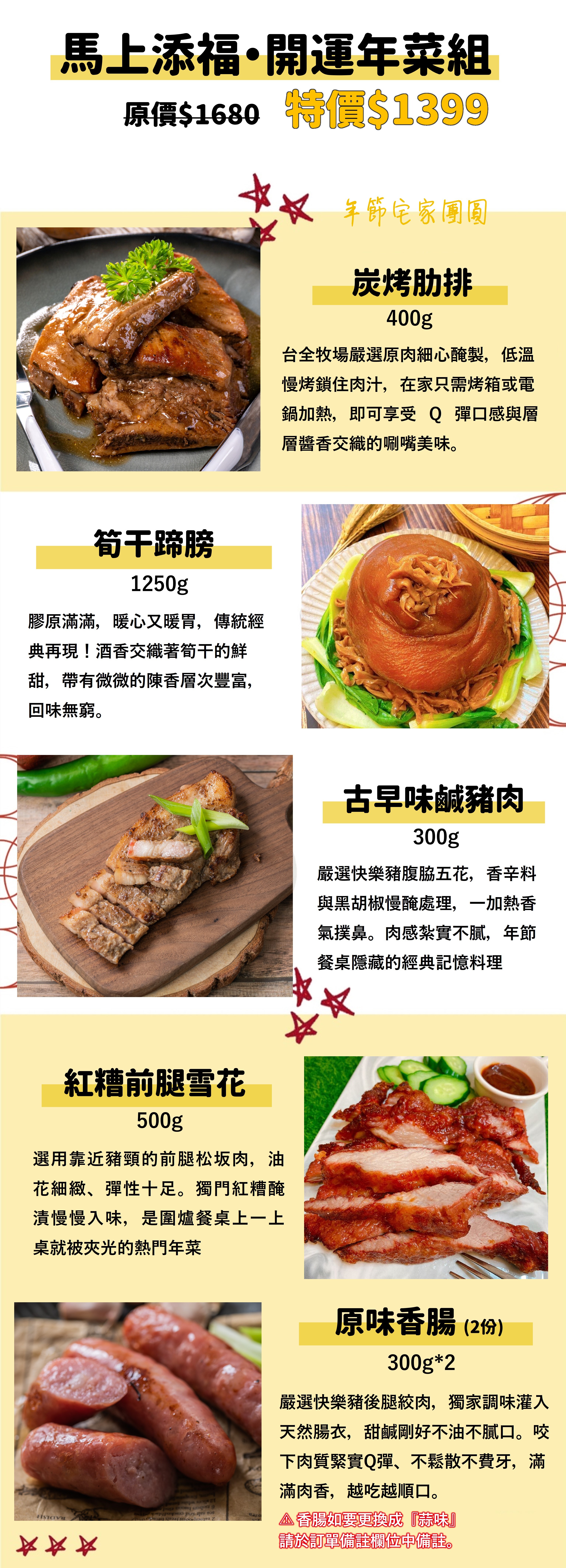 組合包含炭烤肋排400g、筍干蹄膀1250g、鹹豬肉300g、紅糟前腿雪花500g、原味香腸300g*2⚠️如要更換成蒜味,請於訂單備註欄位備註。