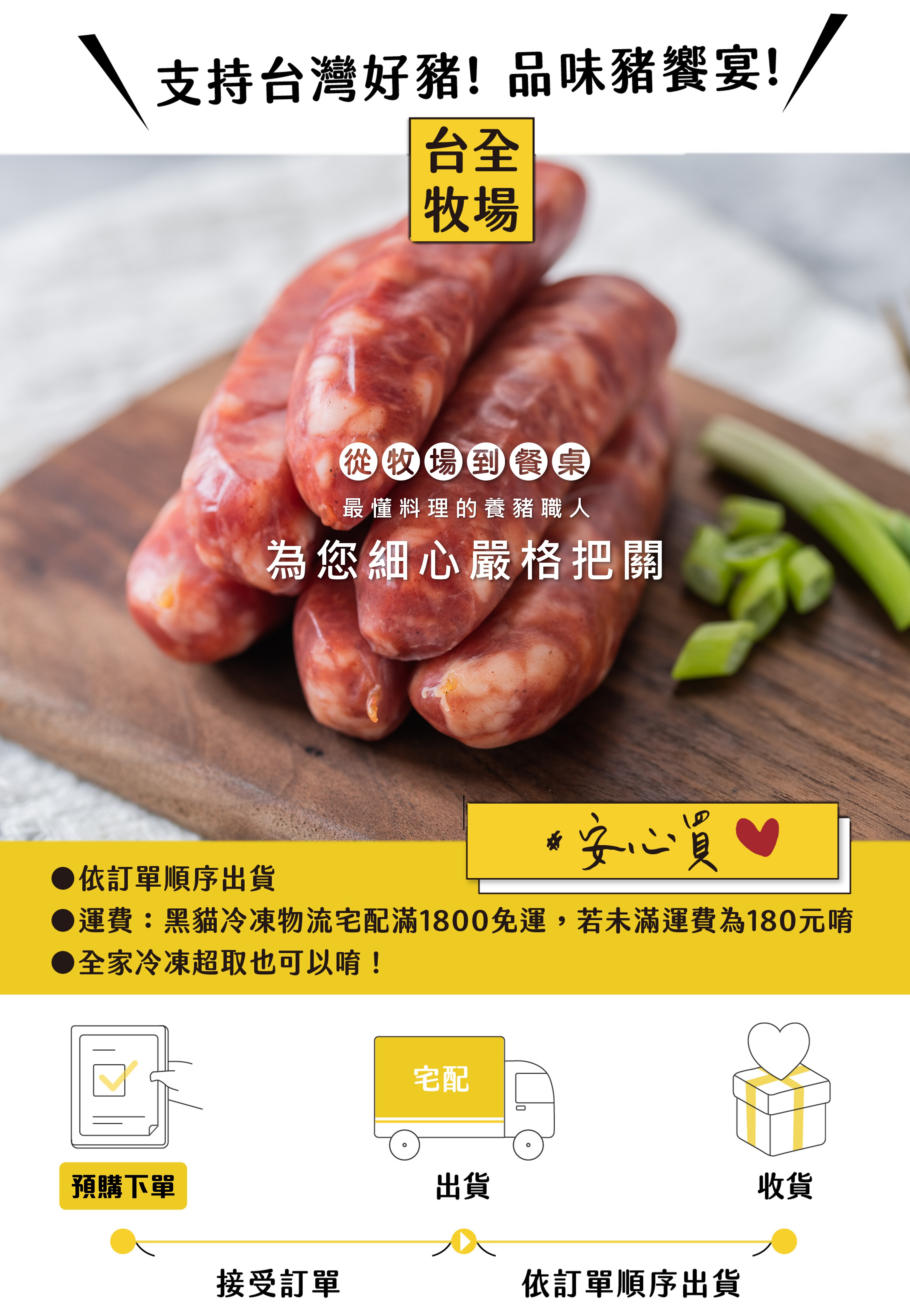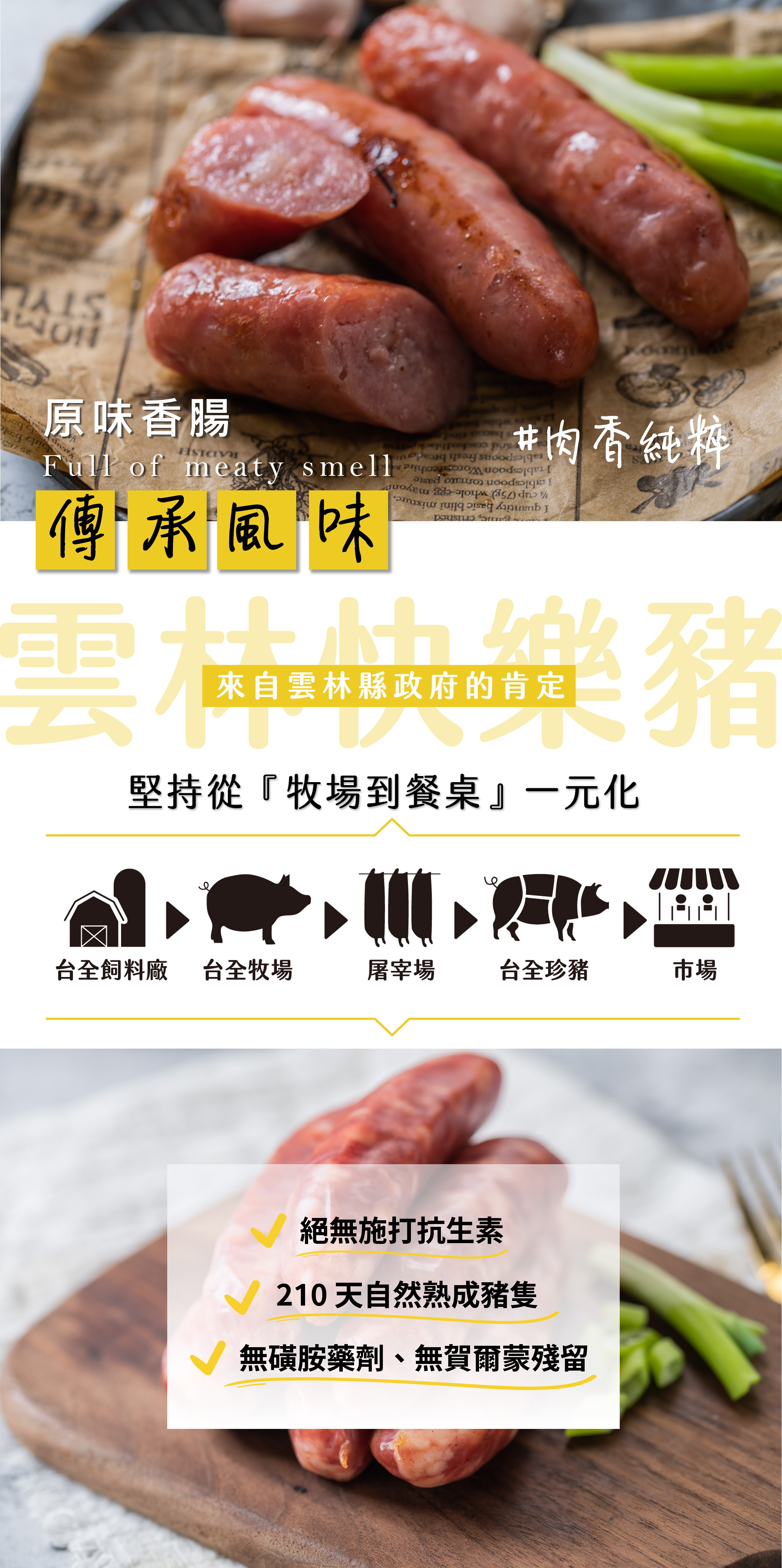 嚴選自快樂豬細膩的後腿絞肉製作,用獨家特製的配料精心製作,再包裹上天然清脆的腸衣,一口咬下都是甜鹹的好滋味!