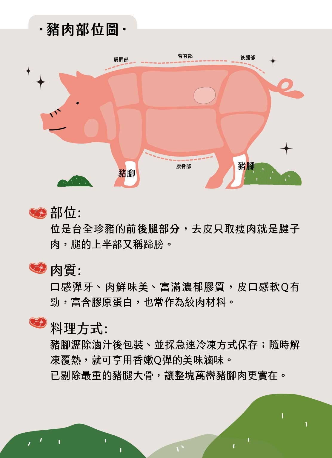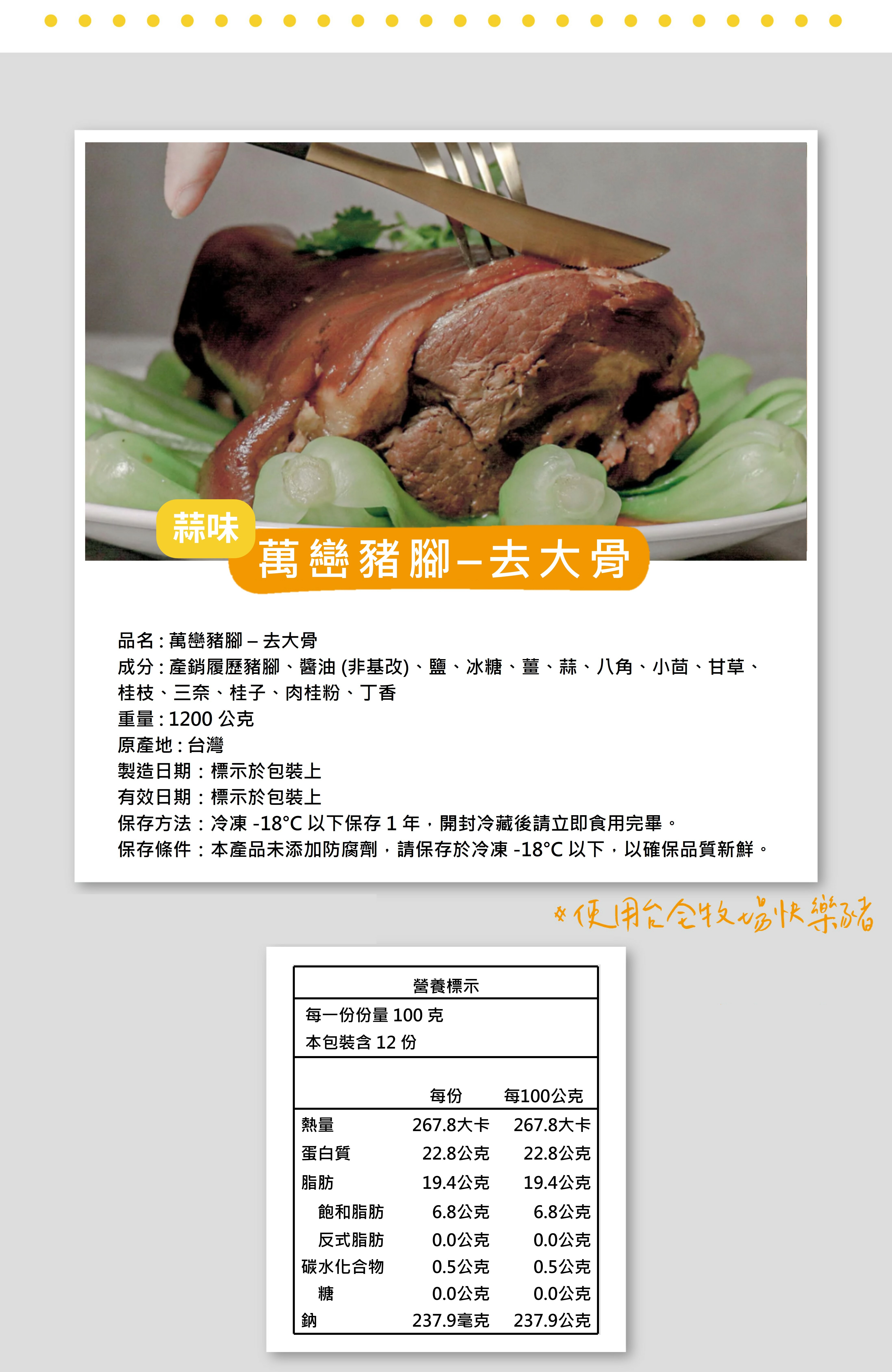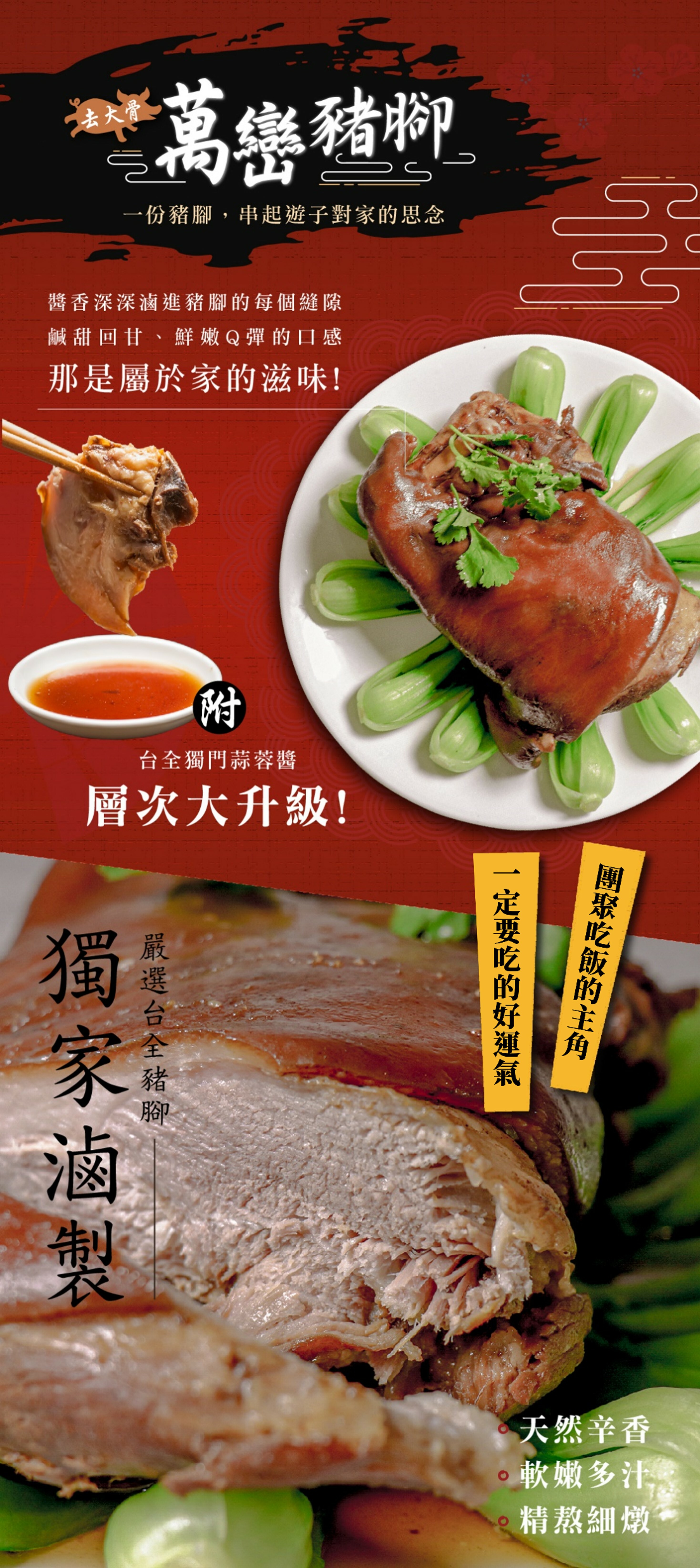 成份:產銷履歷豬腳、醬油(非基改)、鹽、冰糖、薑、蒜、八角、小茴、甘草、桂枝、三奈、桂子、肉桂粉、丁香