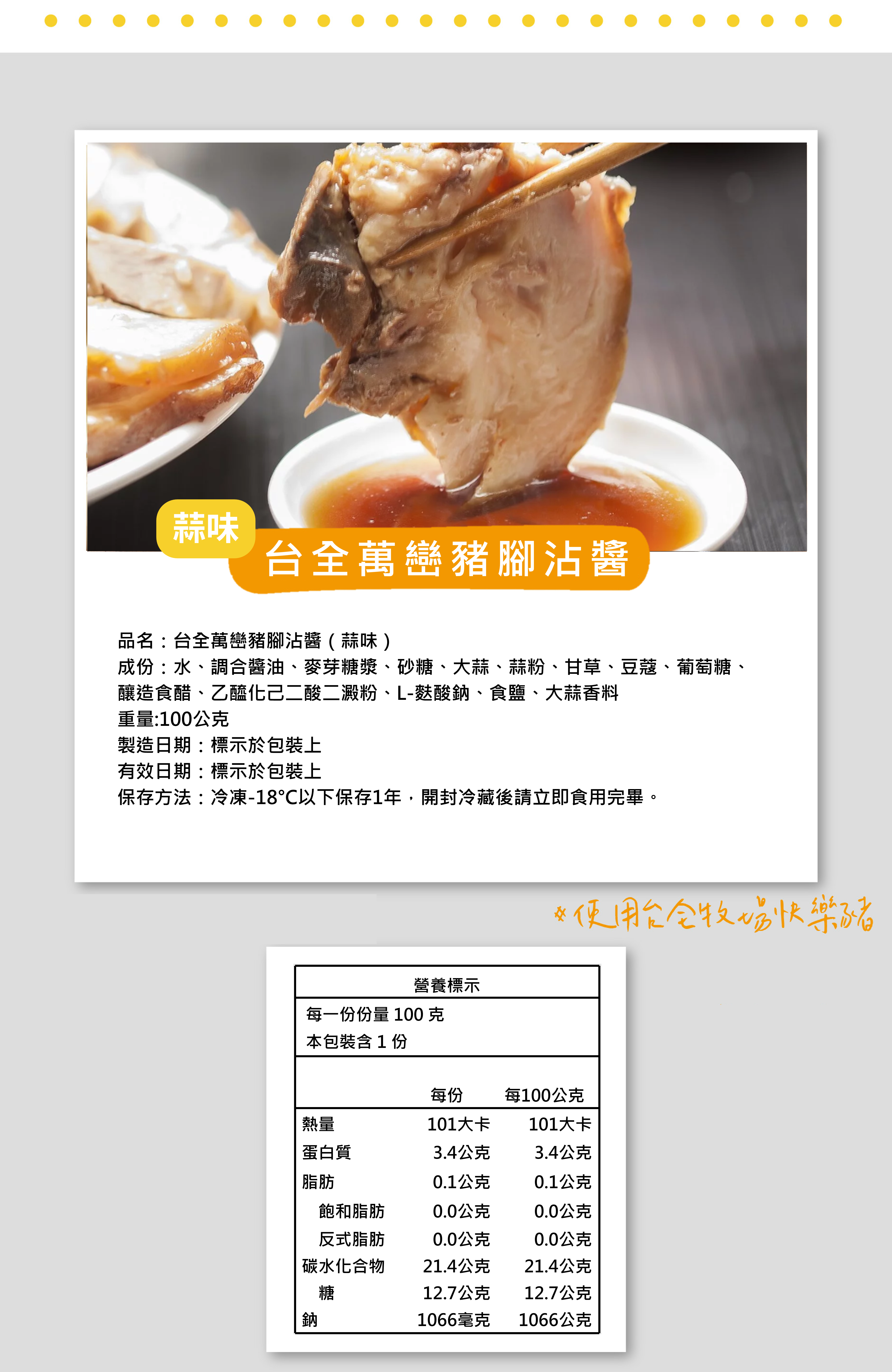 附贈特製蒜蓉醬1包!吃起來不油膩,十分爽口,皮Q肉嫩,豬腳中的極品之作。⚠️效期至2026/5/12。特價商品,售出不做退換,可接受者再下單唷!