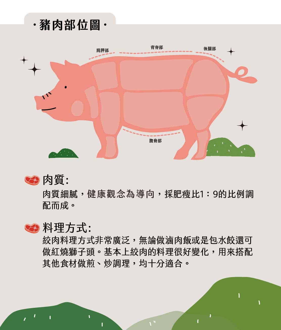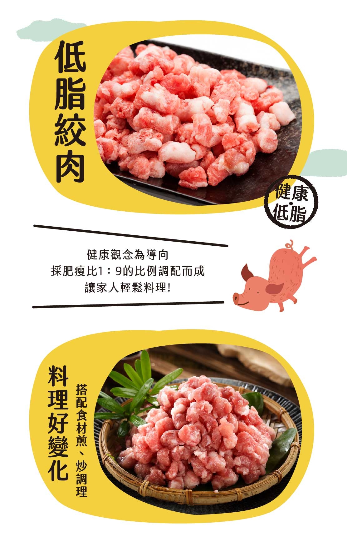 健康觀念為導向,採肥瘦比1:9的比例調配而成。絞肉料理方式非常廣泛,無論做滷肉飯或是包水餃還可做紅燒獅子頭。基本上絞肉的料理很好變化,用來搭配其他食材做煎、炒調理,均十分適合。