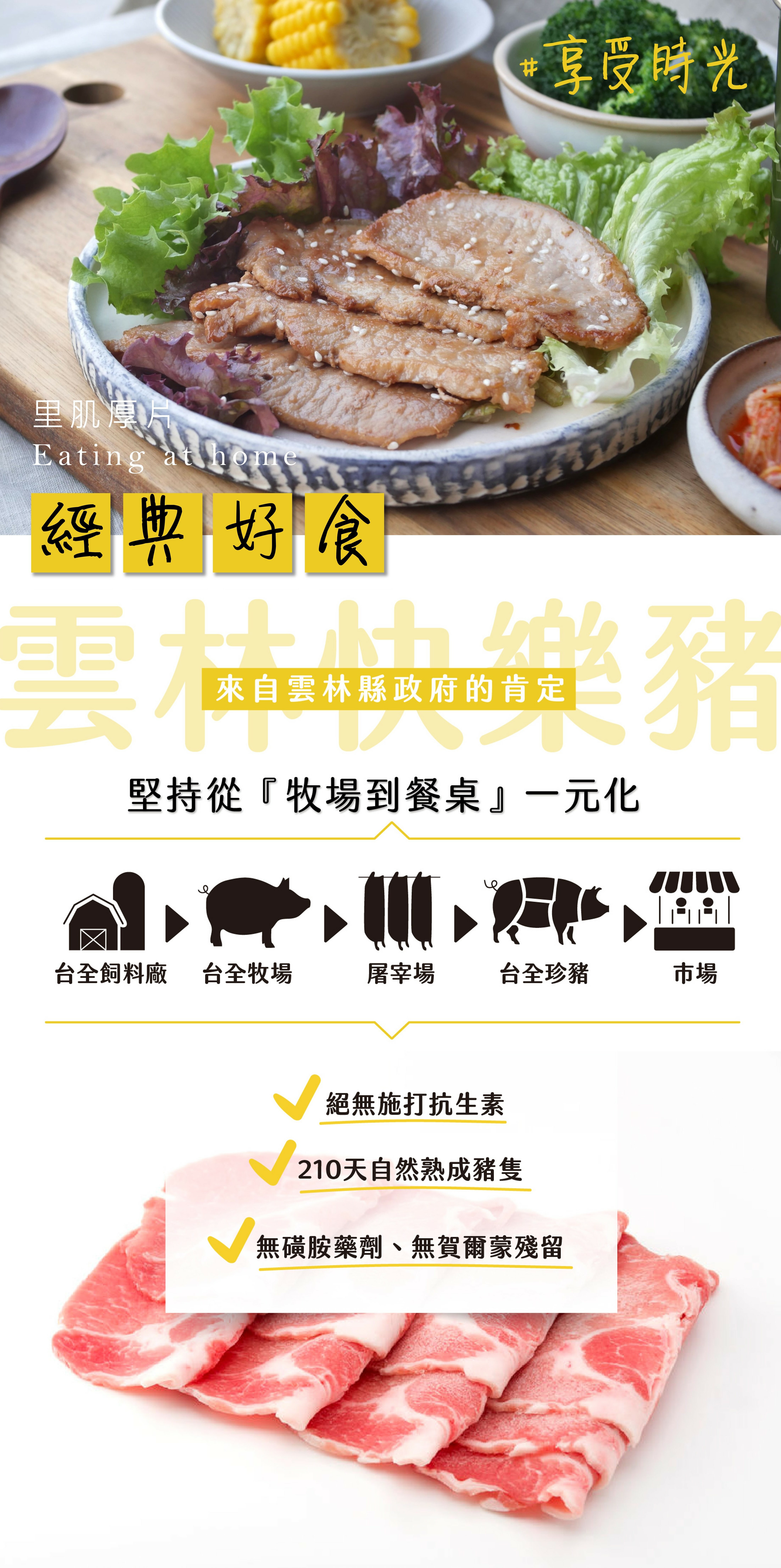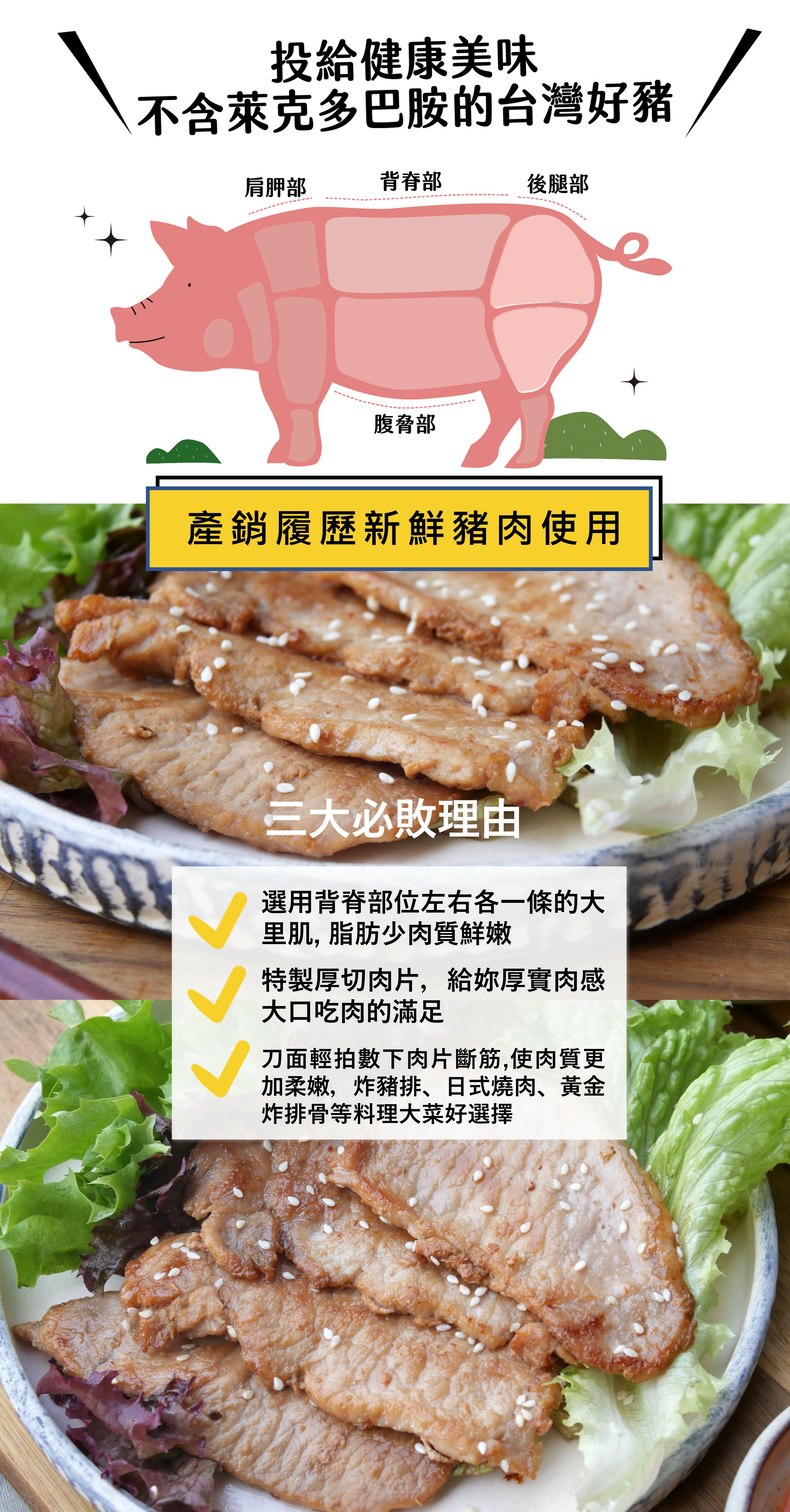 取自豬的背脊部位左右各一條的大里肌,為豬體最大、最長的肌肉,因豬隻平常很少運動到此部位,因此肉質鮮嫩,加上只含少許脂肪,最適合用來煎、炸、炒等料理,以刀面輕拍數下,可使肉質更加柔嫩,如炸豬排、早餐肉等。