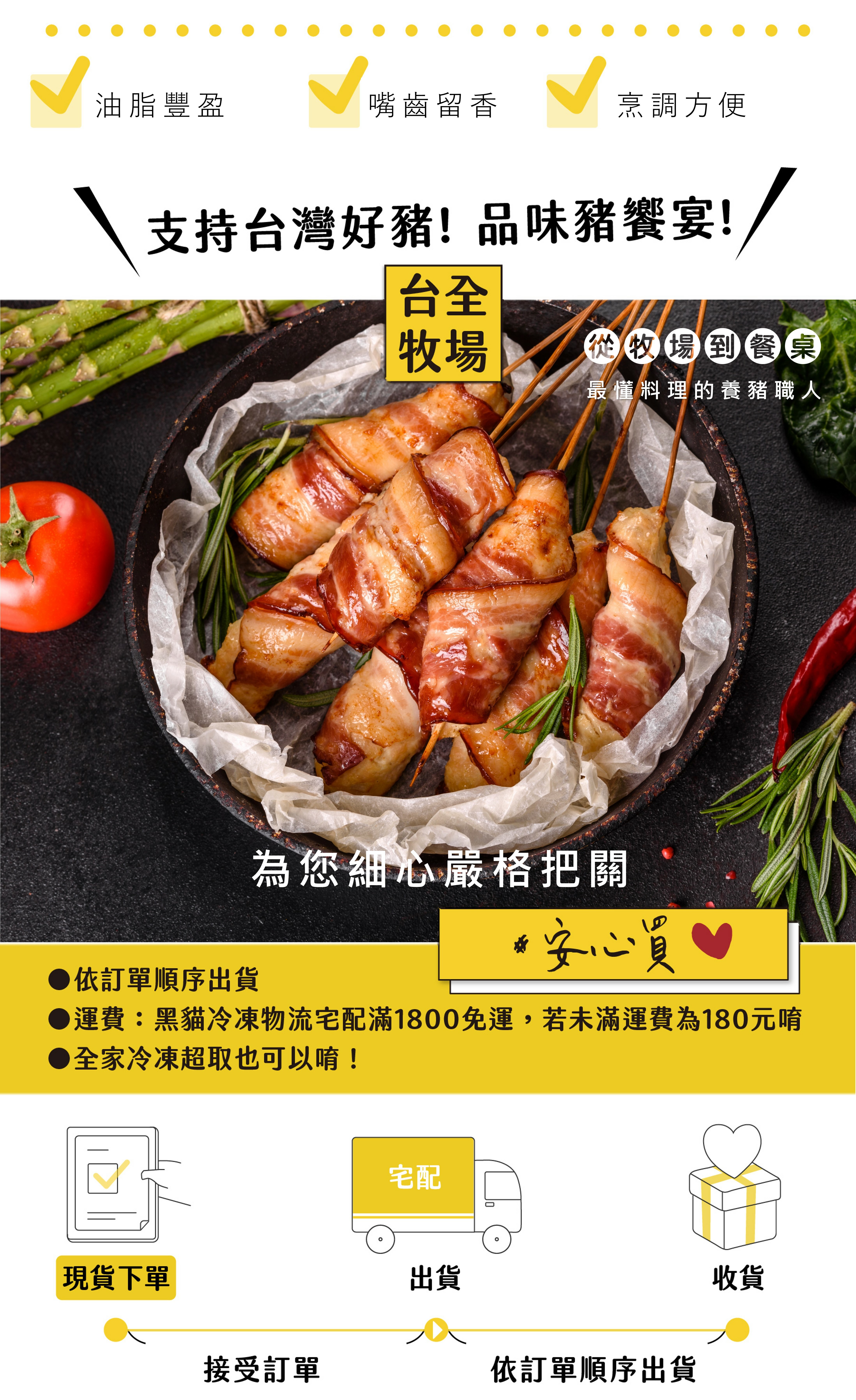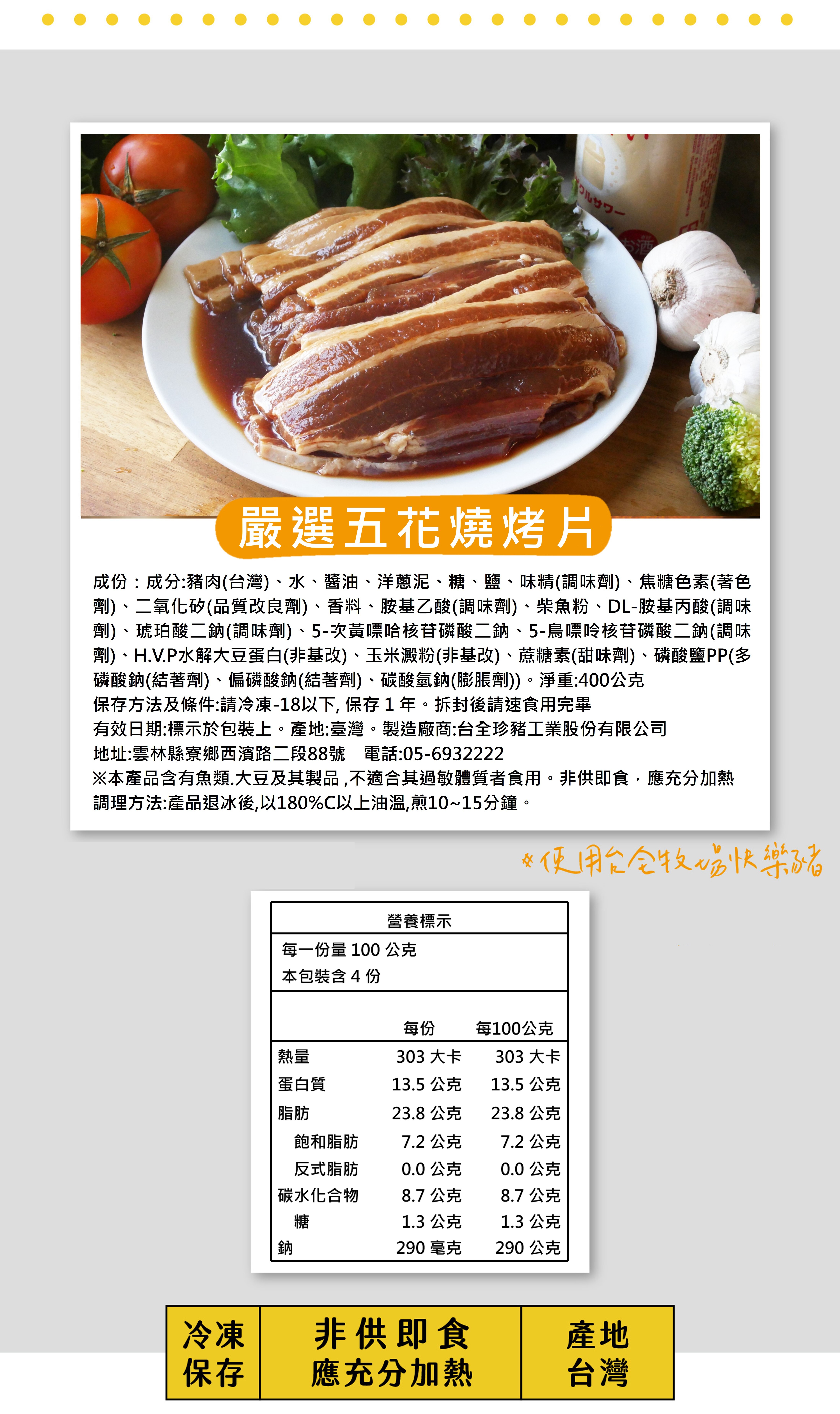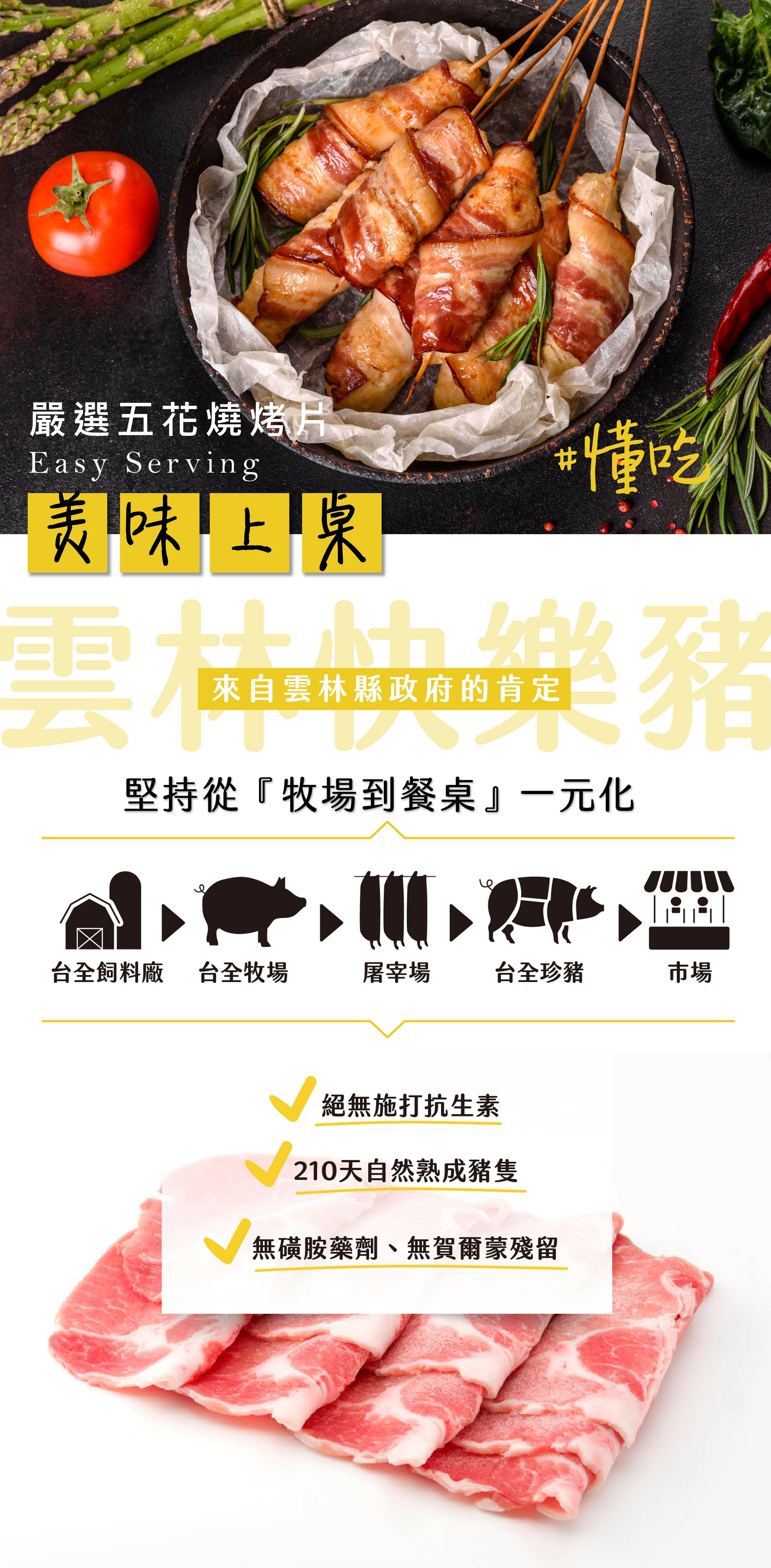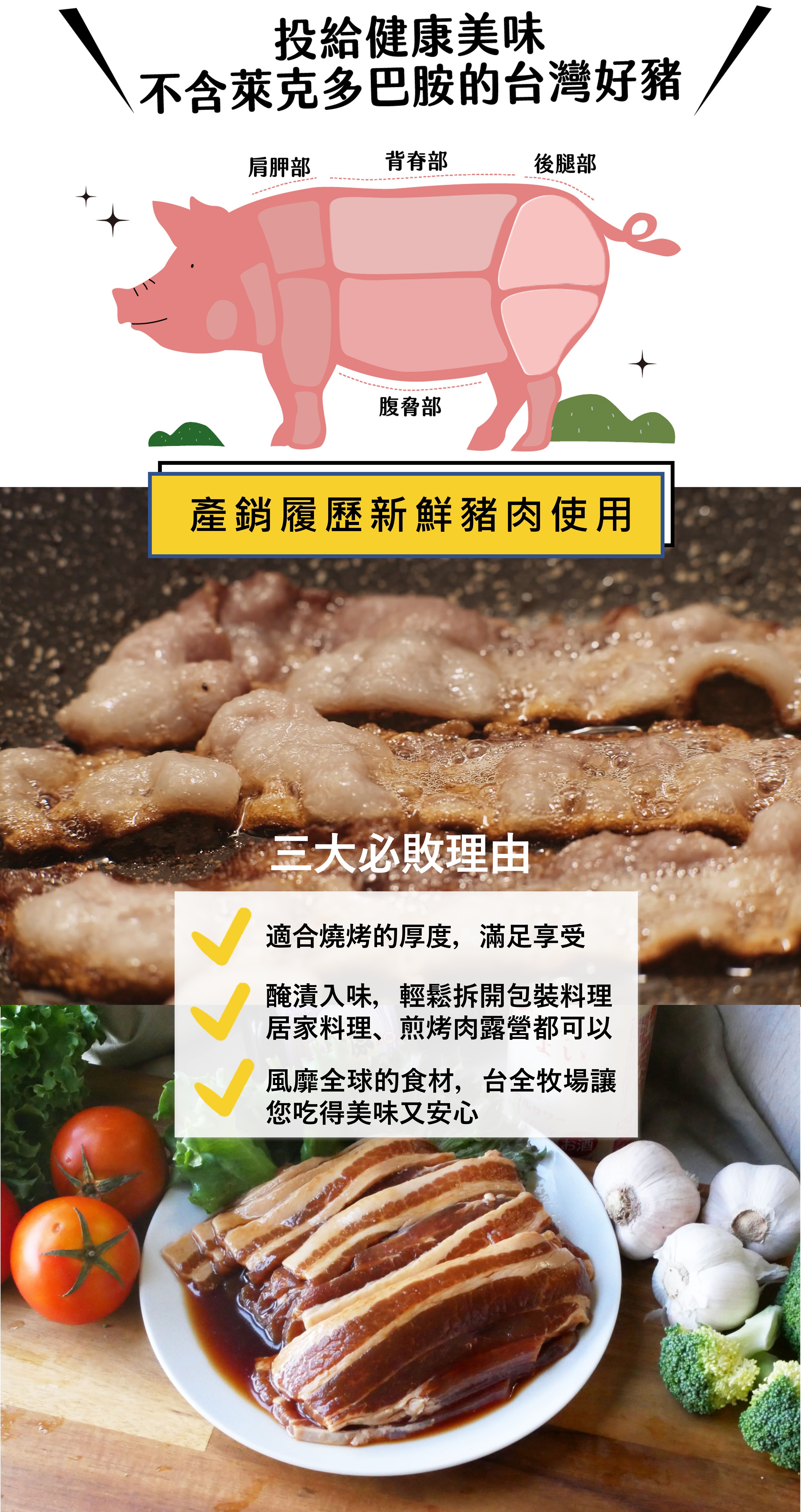 嚴選快樂豬五花部位,帶有均勻油脂,不乾不柴,再搭配上獨家秘製料醃漬!解凍後簡單乾煎,料理超方便~