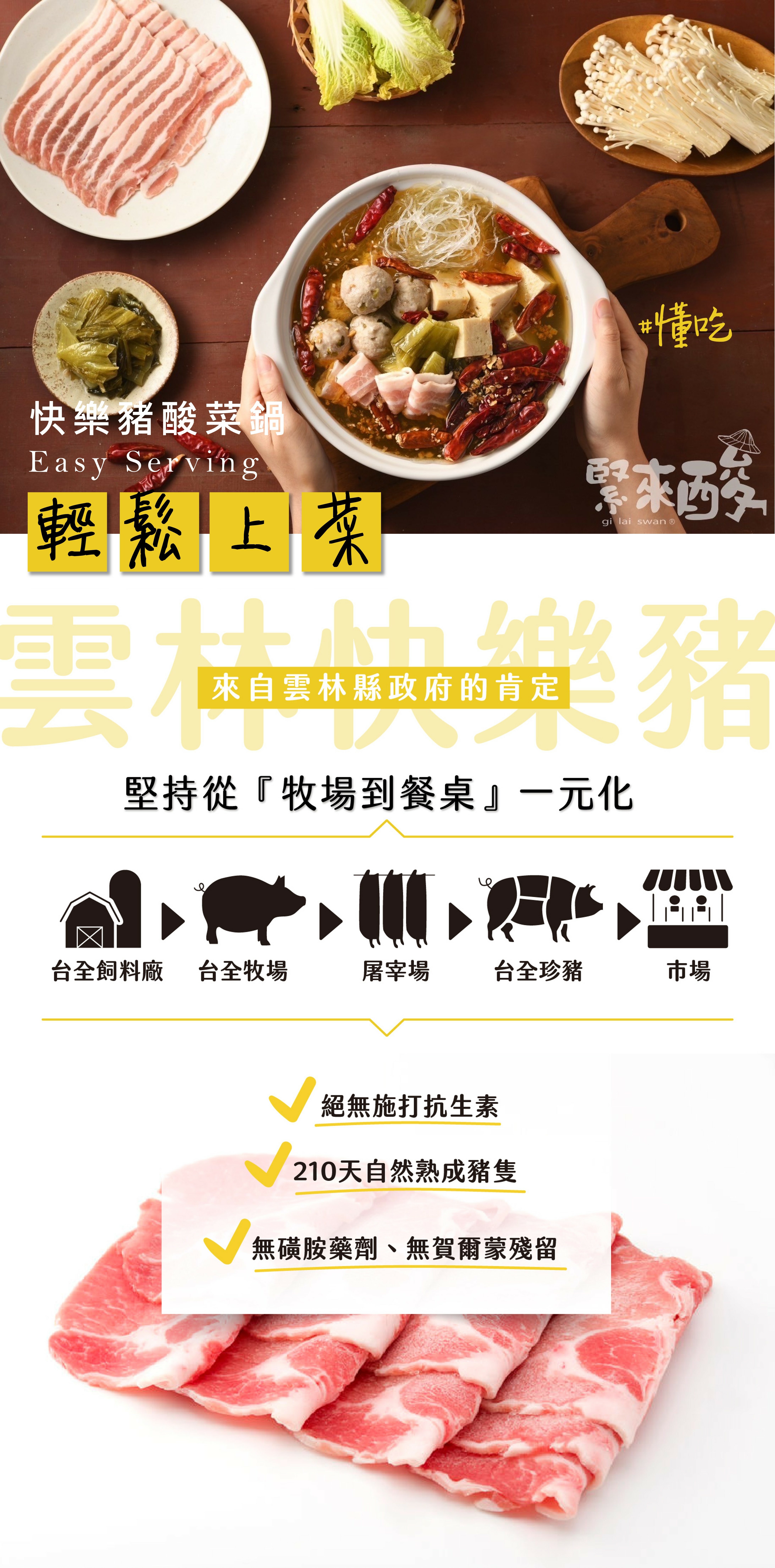-內容物:五花肉片250g、凍豆腐、酸菜貢丸、冬粉、乾辣椒包、特調油包